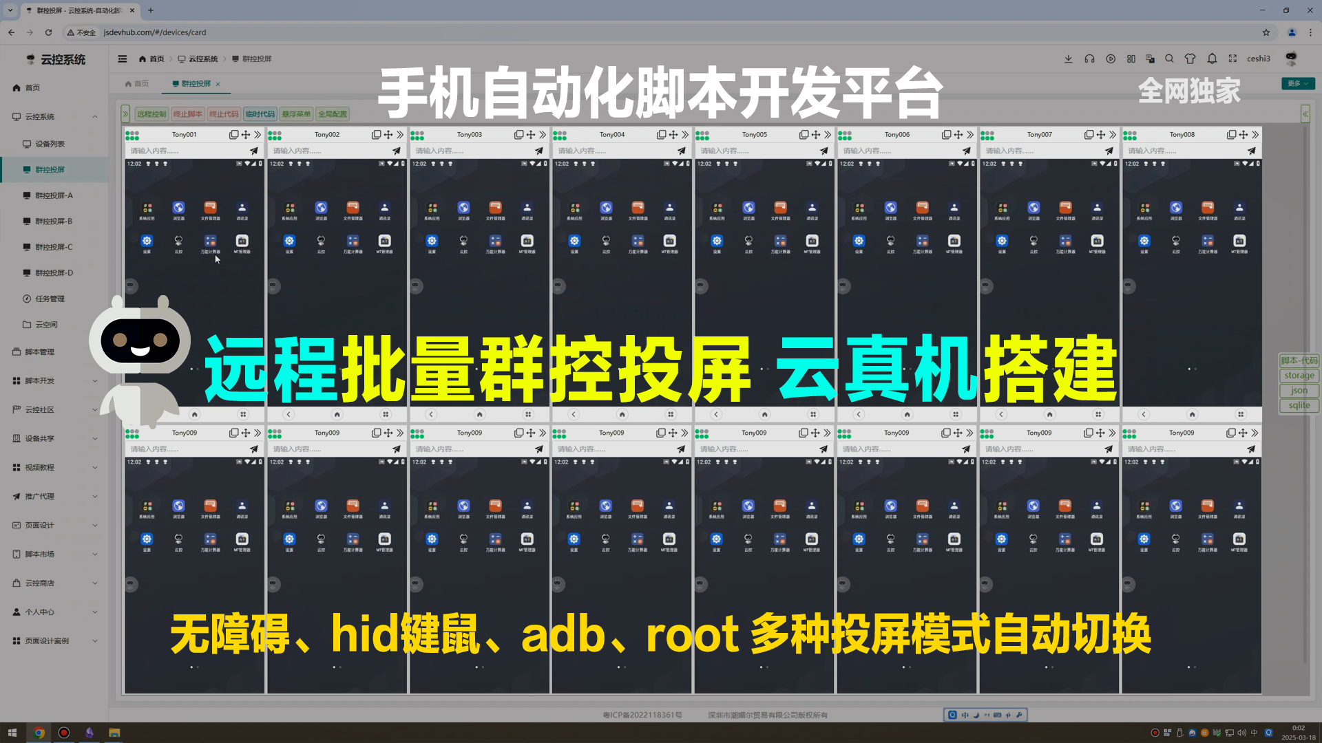 CloudControl is a powerful mobile automation development platform, integrating script editing, remote screen casting (global cross-network direct connection, no geographic or network limitations), AI visual control, and supports multi-device synchronization, enabling efficient device cluster management.