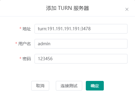在添加 TURN 服务器窗口中填写 Coturn 服务器的公网 IP、端口,以及对应的用户名和密码,保存配置。