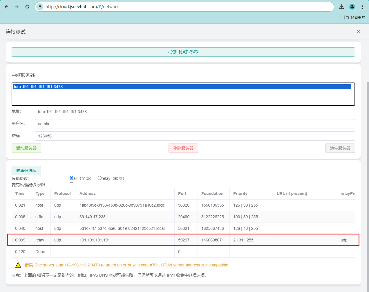 relay,并且对应的公网 IP 地址为191.191.191.191(你的 TURN 服务器公网 IP),说明中继服务器成功响应。这表明你的 TURN 服务搭建成功,能够为客户端提供中继转发功能。 - 如果没有出现